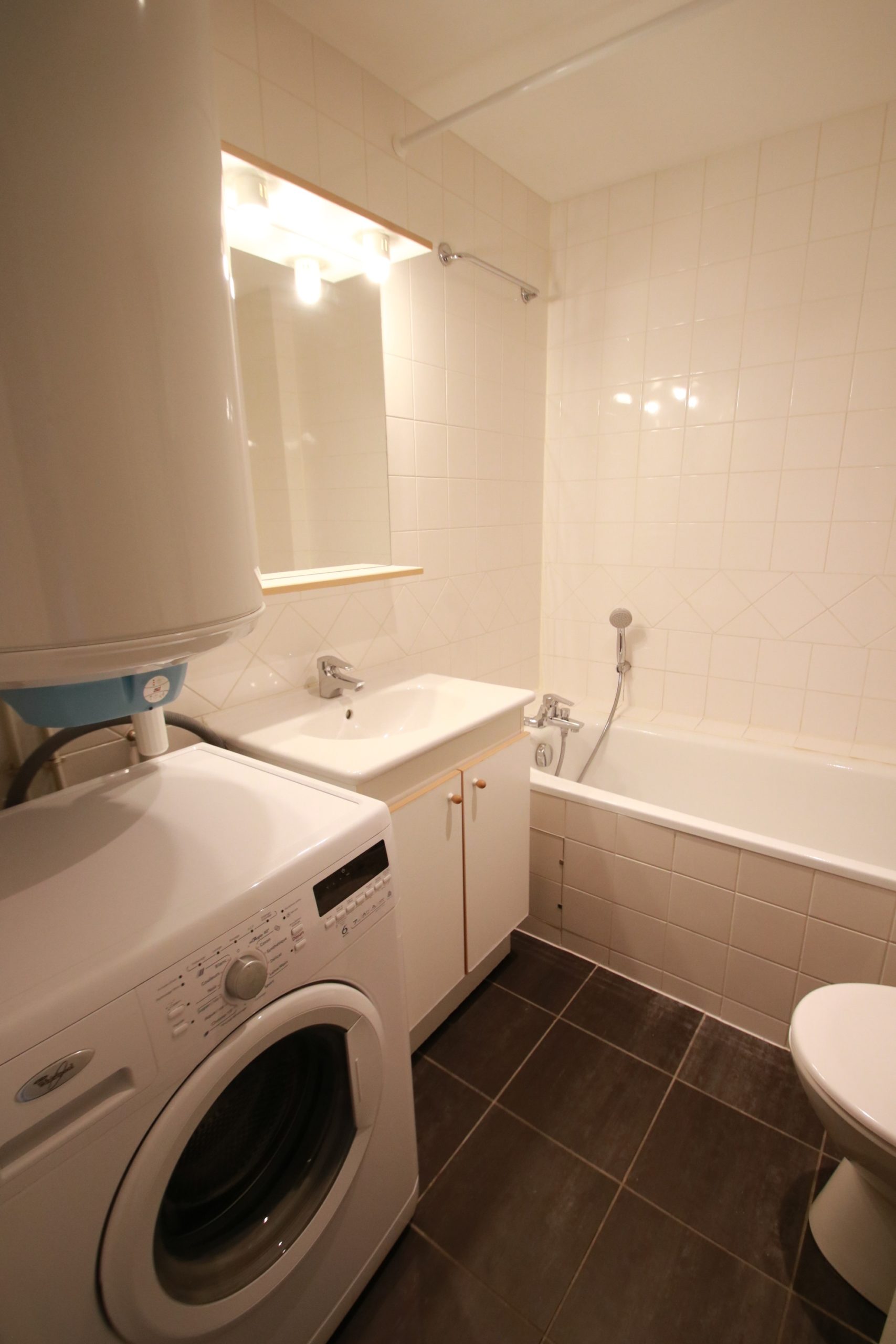 • Salle de bain avec baignoire, machine à laver et WC